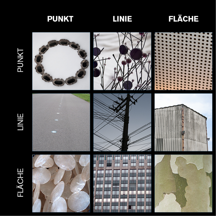 Form, Farbe, Struktur, Helligkeit, Kontrast, Größe, Menge, Stellung, Proportionen, Rhythmus, Stoff und vieles mehr.
